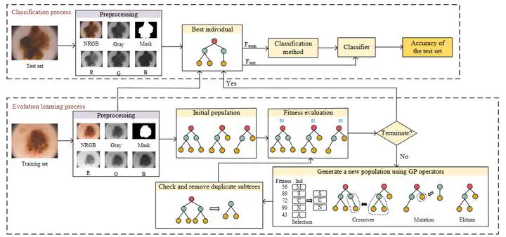 Image credit: Unsplash恶性黑色素瘤是一种致死率极高的皮肤癌,早期诊断能显著降低死亡率。许多计算机辅助诊断(CAD)系统作为第二诊断意见工具被开发出来,以协助皮肤科医生诊断恶性黑色素瘤。然而,传统CAD系统通常需要领域知识进行特征提取,而基于神经网络的CAD系统需要专业知识设计网络结构且往往可解释性较差。本文提出一种基于遗传规划(GP)的新型皮肤癌CAD系统,能够自动学习有效分类特征并具备强可解释性。该方法通过相对简单的程序结构、新型函数集和终端集,可自动演化变长度模型以提取描述皮肤癌症图像的信息化特征。此外,与其他GP方法相比,本研究采用新提出的重复子树消除机制,能有效避免特征重复,从而简化模型并增强可解释性。所提方法在五个真实皮肤癌分类任务中得到验证,结果表明在多数情况下,其性能优于基于GP的特征学习方法、基于神经网络的特征学习对比方法及传统对比方法。进一步分析表明,该方法采用更精简的树结构,能自动演化/学习具有潜在高可解释性的模型。